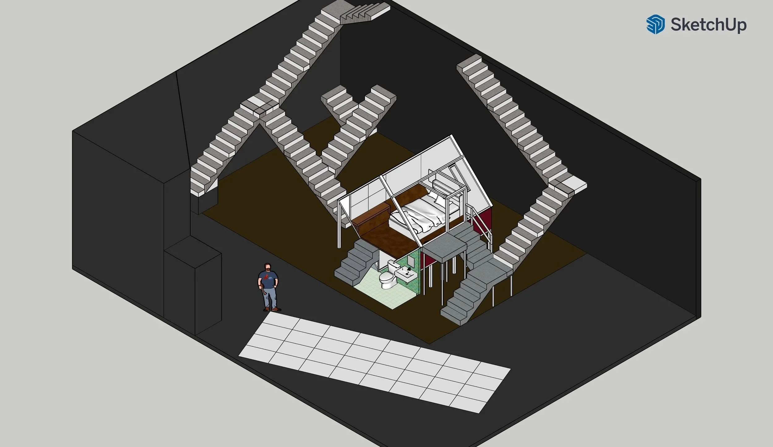 For this set design, I decided to depict such an abstract phenomenon in one shot, with numerous stairs leading to the walls and a very narrow, tilted cube shaped room.