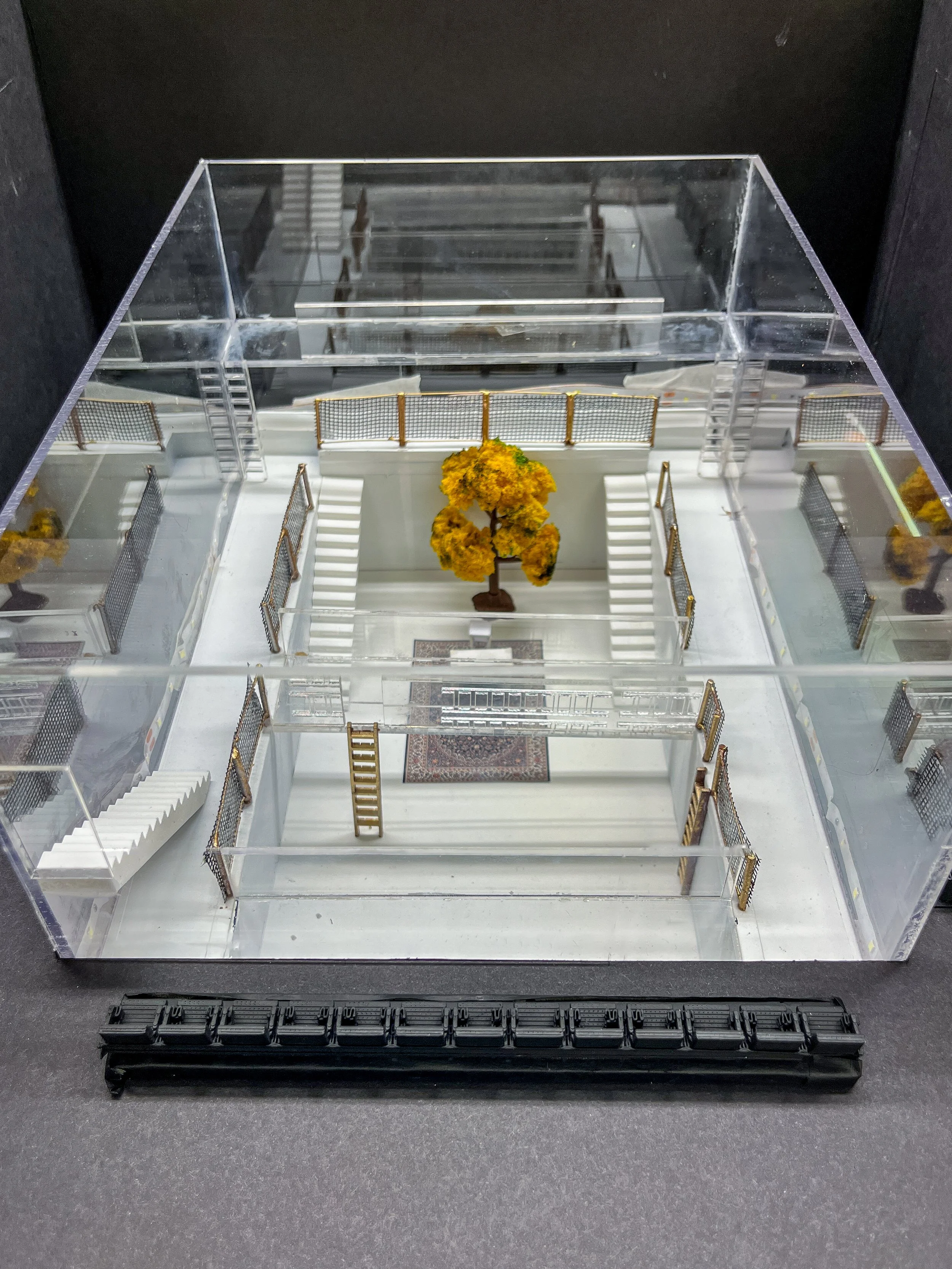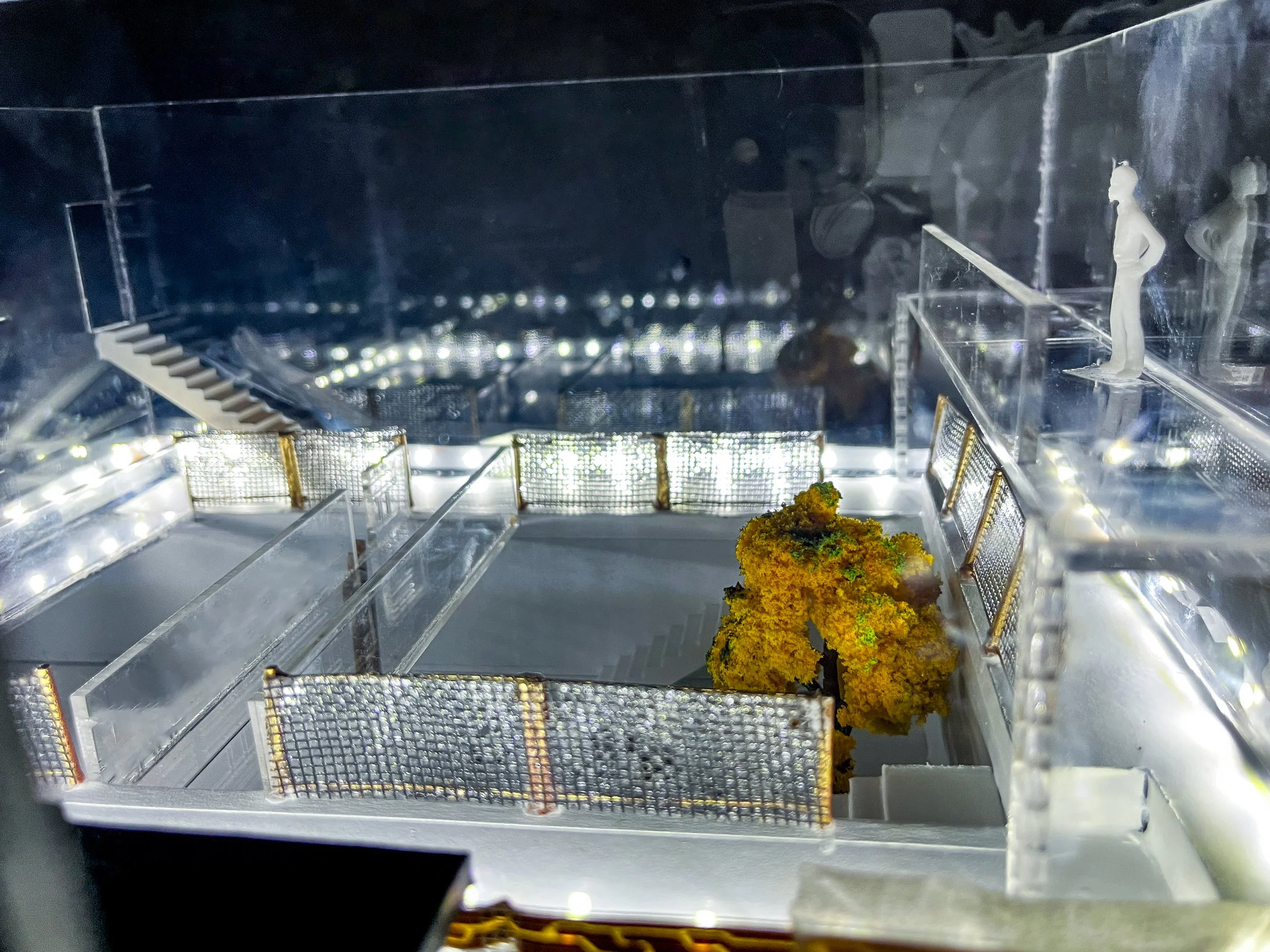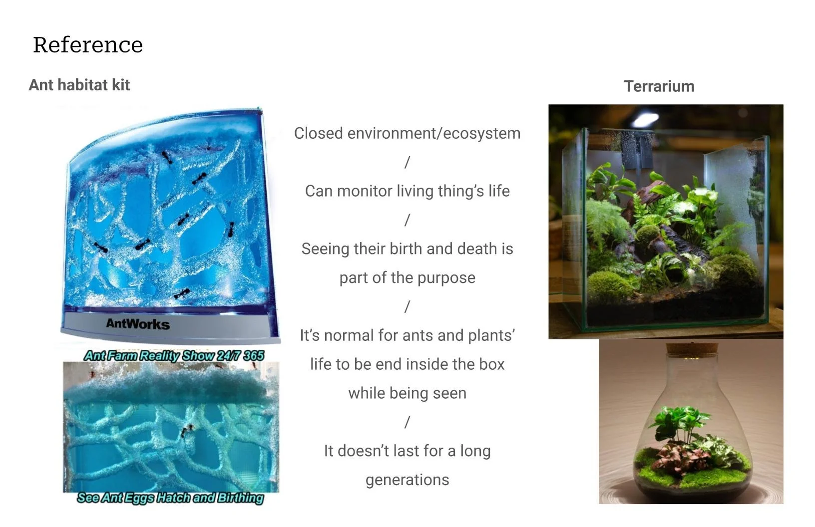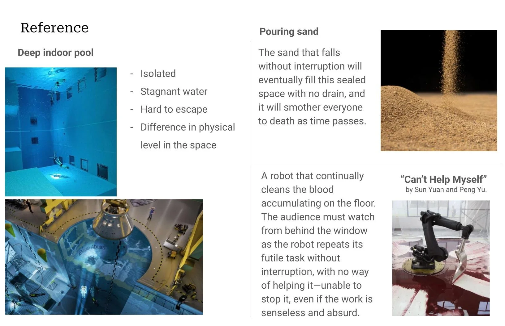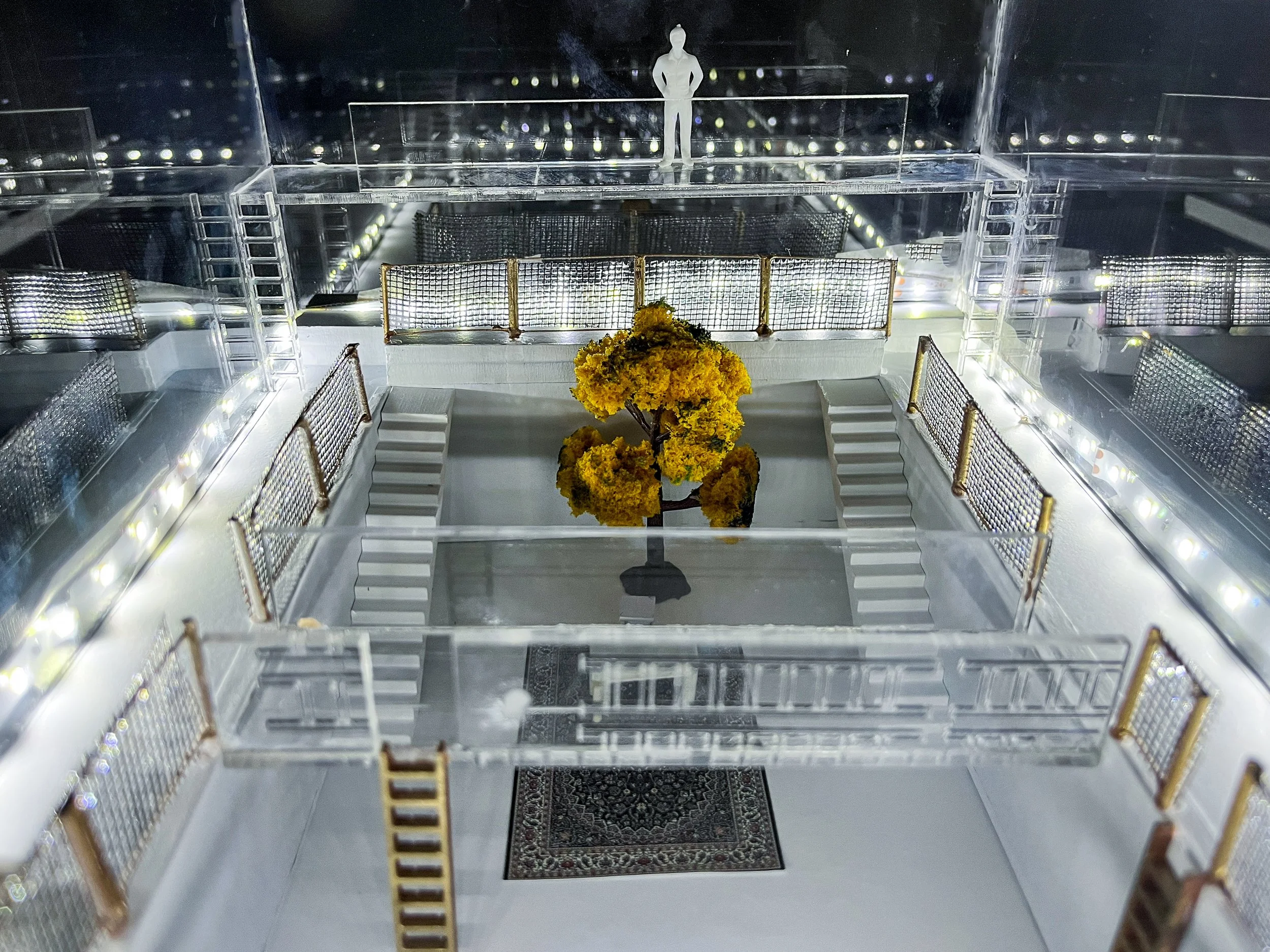 This set design translates the structure into an enclosed observation space. The audience watches from outside, like observing an ant farm, fully aware of the repetition and futility of the actions inside yet unable to intervene. The set adopts a minimal white palette and transparent glass walls to evoke an ant-farm or lab-like environment, reinforcing the audience’s role as detached observers.